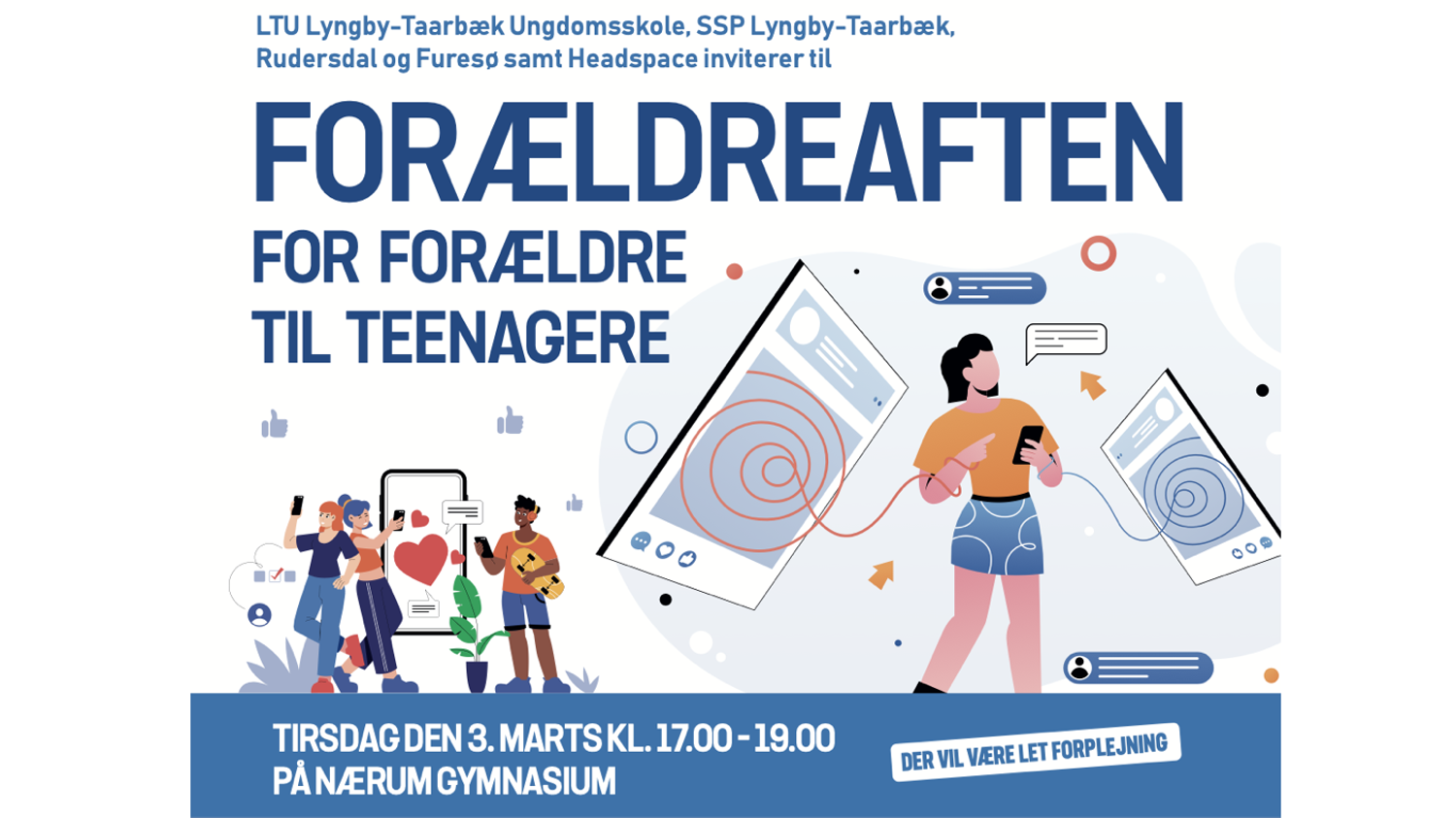 Ungdomsskolen Lyngby-Taarbæk (LTU) gennemfører i samarbejde med Headspace Lyngby og SSP i Lyngby-Taarbæk, Furesø og Rudersdal kommuner tre årlige temaaftener for forældre til teenagere. Formålet er at styrke forældre i deres rolle og skabe dialog om unges trivsel og hverdagsliv.
